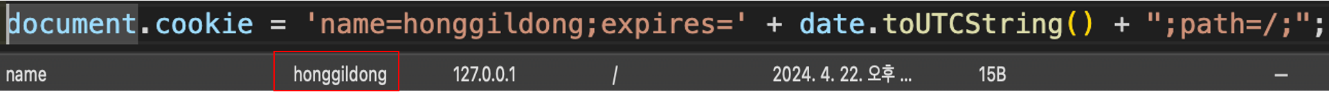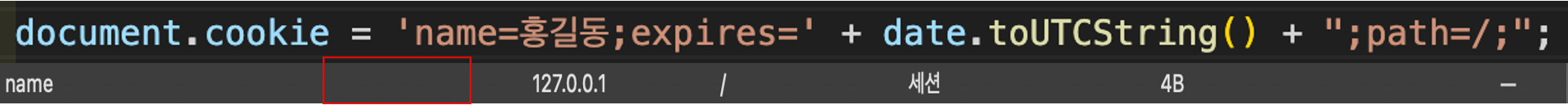 document.cookie = '키=값'