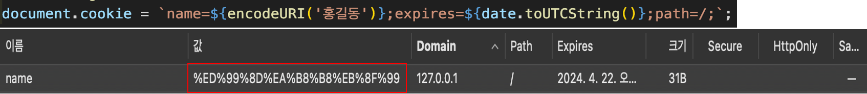 쿠키는 아스키 문자집합만 지원을 하여 이외의 문자인 한글은 쿠키에 저장할 수 없다.