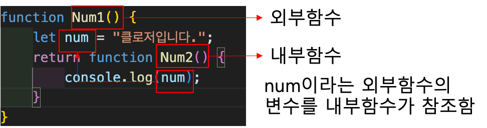 정의는 어려워보이지만 쉽게 말하자면 어떤 함수의 내부에 정의된 다른 함수가 상위 스코프의 변수나 매개변수를 참조하는 내부함수를 클로저라고 한다.