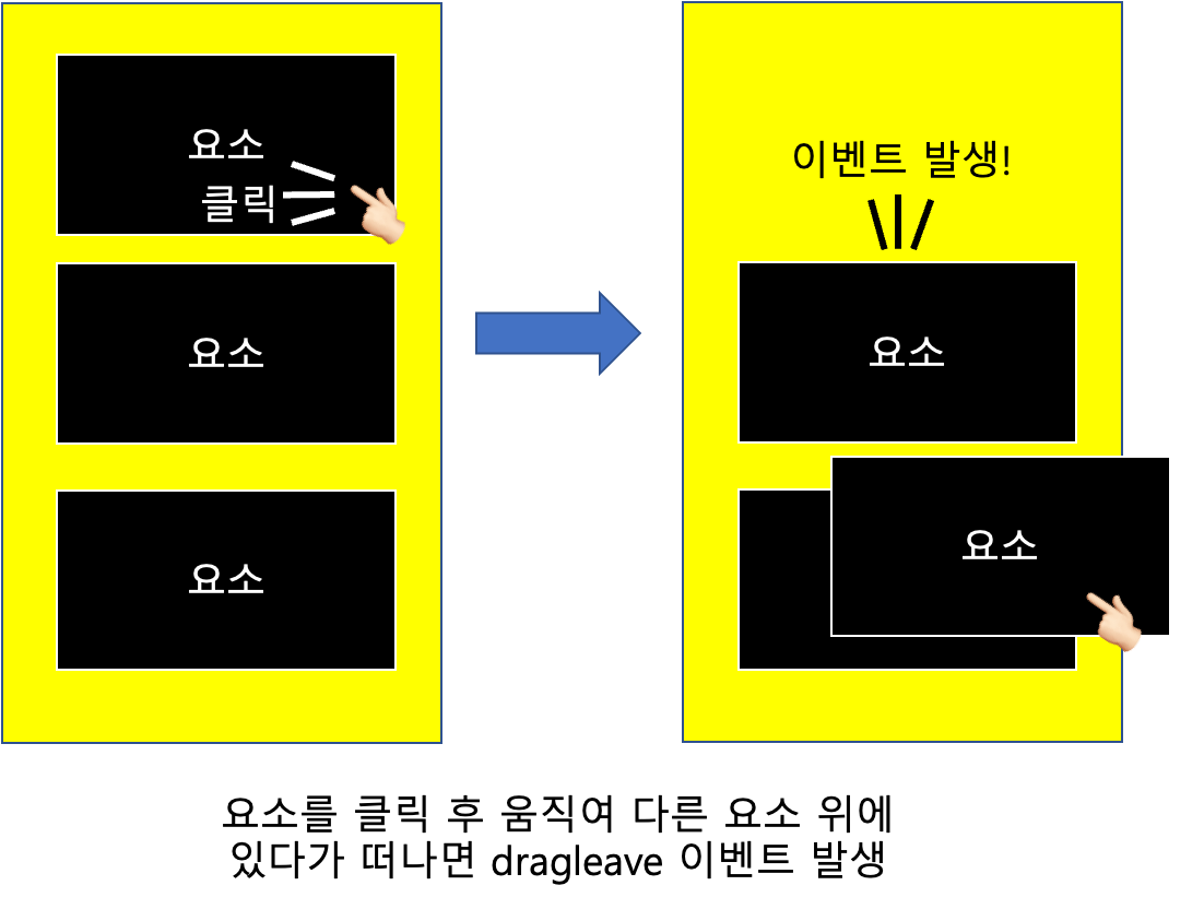 - 드래그 하던 요소가 다른 요소 위에 위치했다가 떠나면 발생하는 이벤트