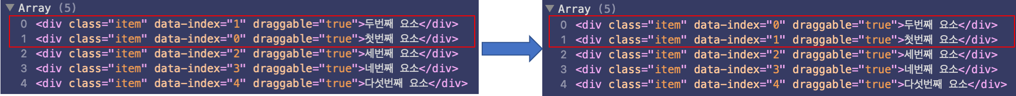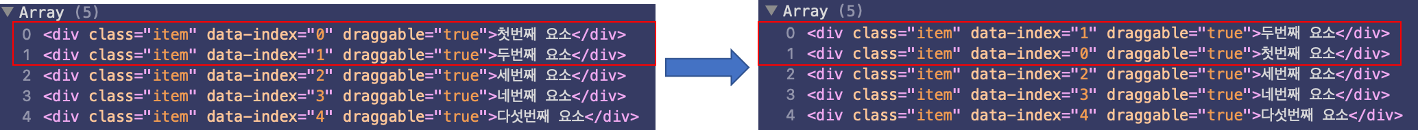 첫번째 요소를 두번째 요소에 올리고 드랍을 했을 때 배열의 위치가 바뀌었다. 하지만 코드를 보면 각 요소의 dataset의 값을 배열의 index로 사용하고 있다. 위치가 변경이 되어도 dataset은 그대로이기 나중에 문제가 생길 수 있기 때문에 dataset을 위치에 맞게 변경해주어야 한다.